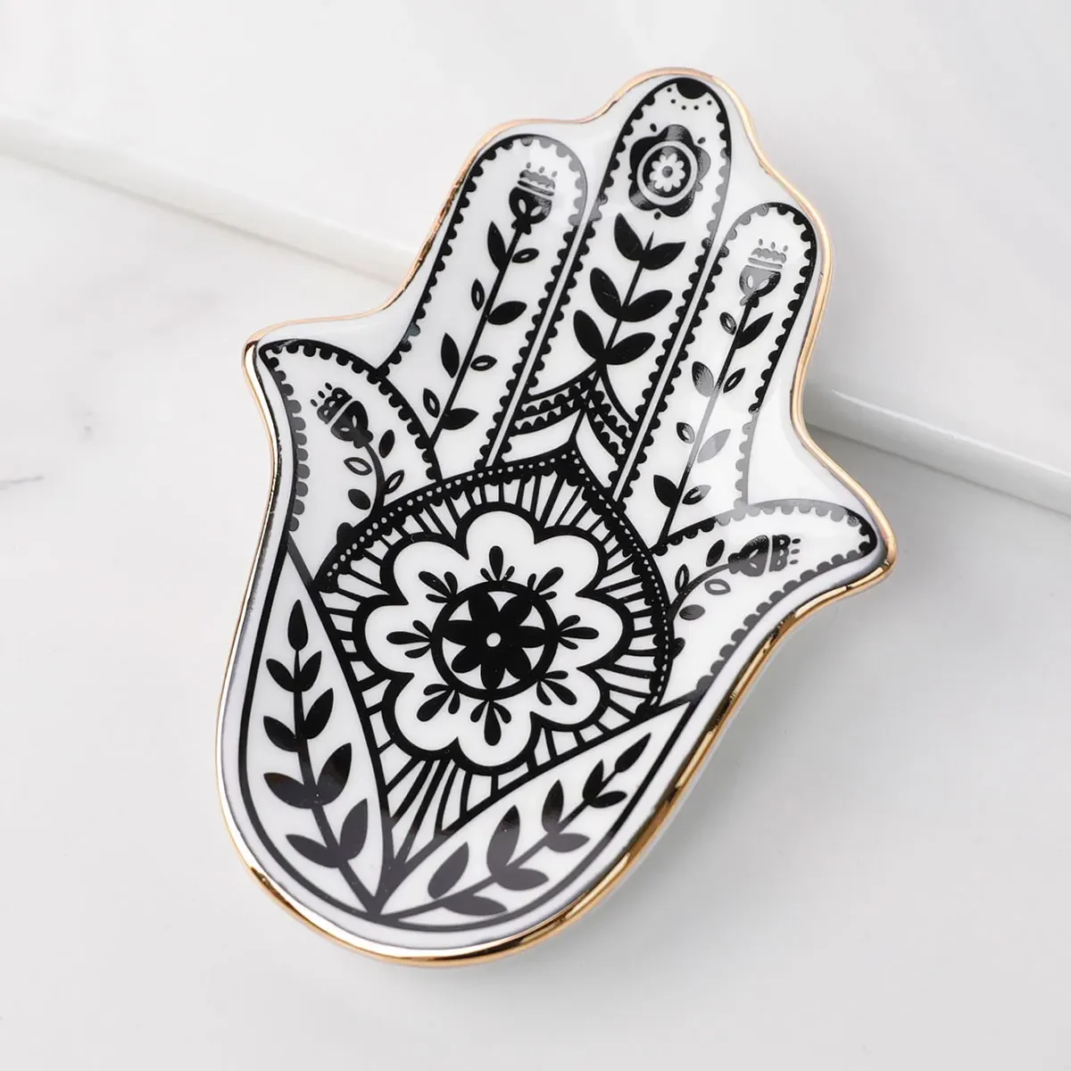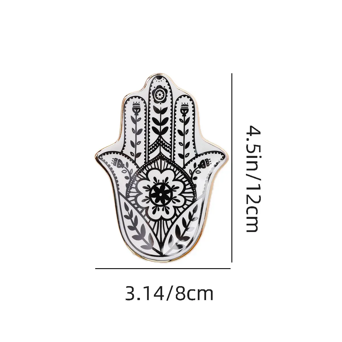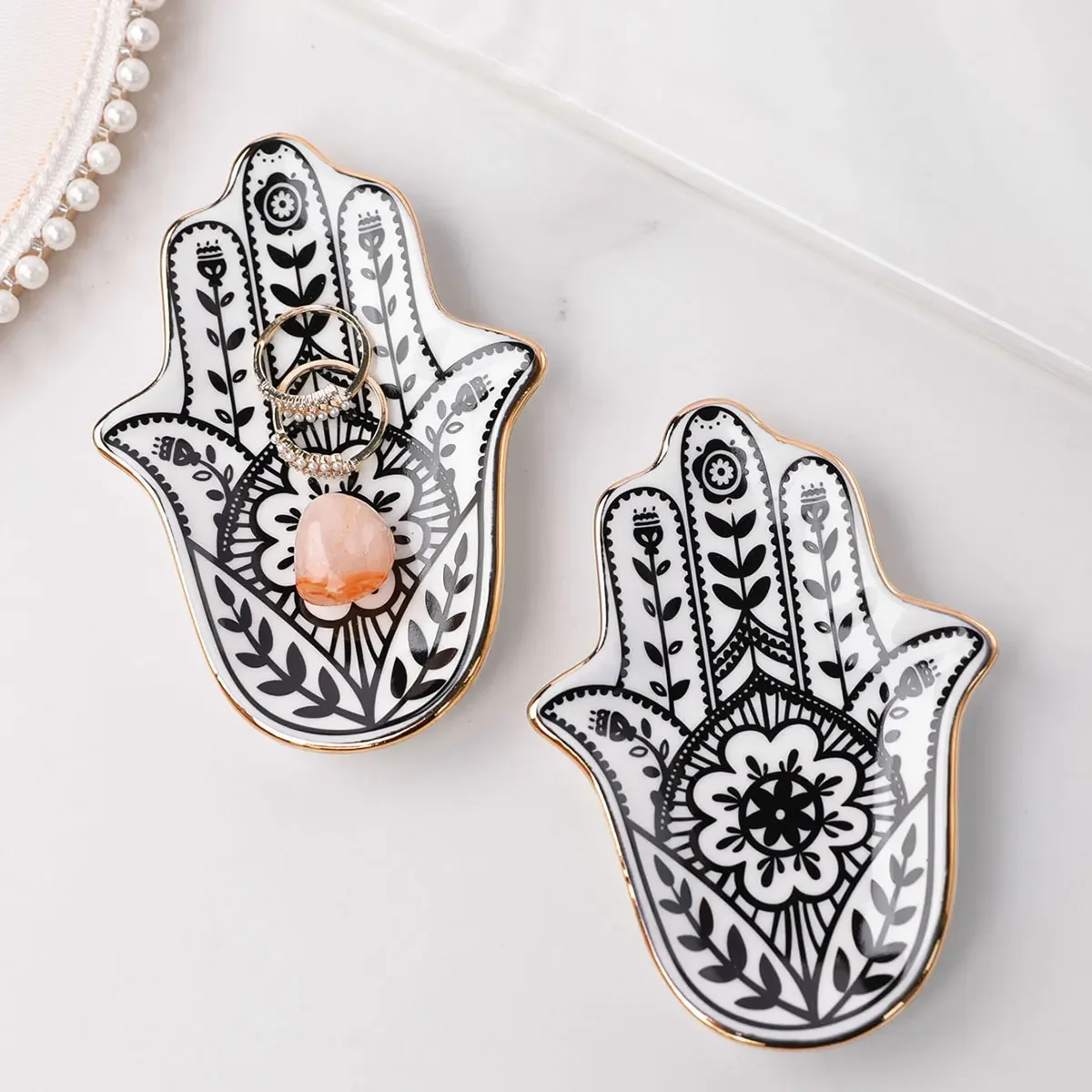 2. **Small Jewelry Tray with Hamsa Hand Design**: This decorative ceramic plate is both functional and stylish. Its round shape and European-inspired design make it a versatile storage solution for trinkets and jewelry. Free from harmful chemicals, it’s a safe and beautiful addition to your home decor. Origin: China.