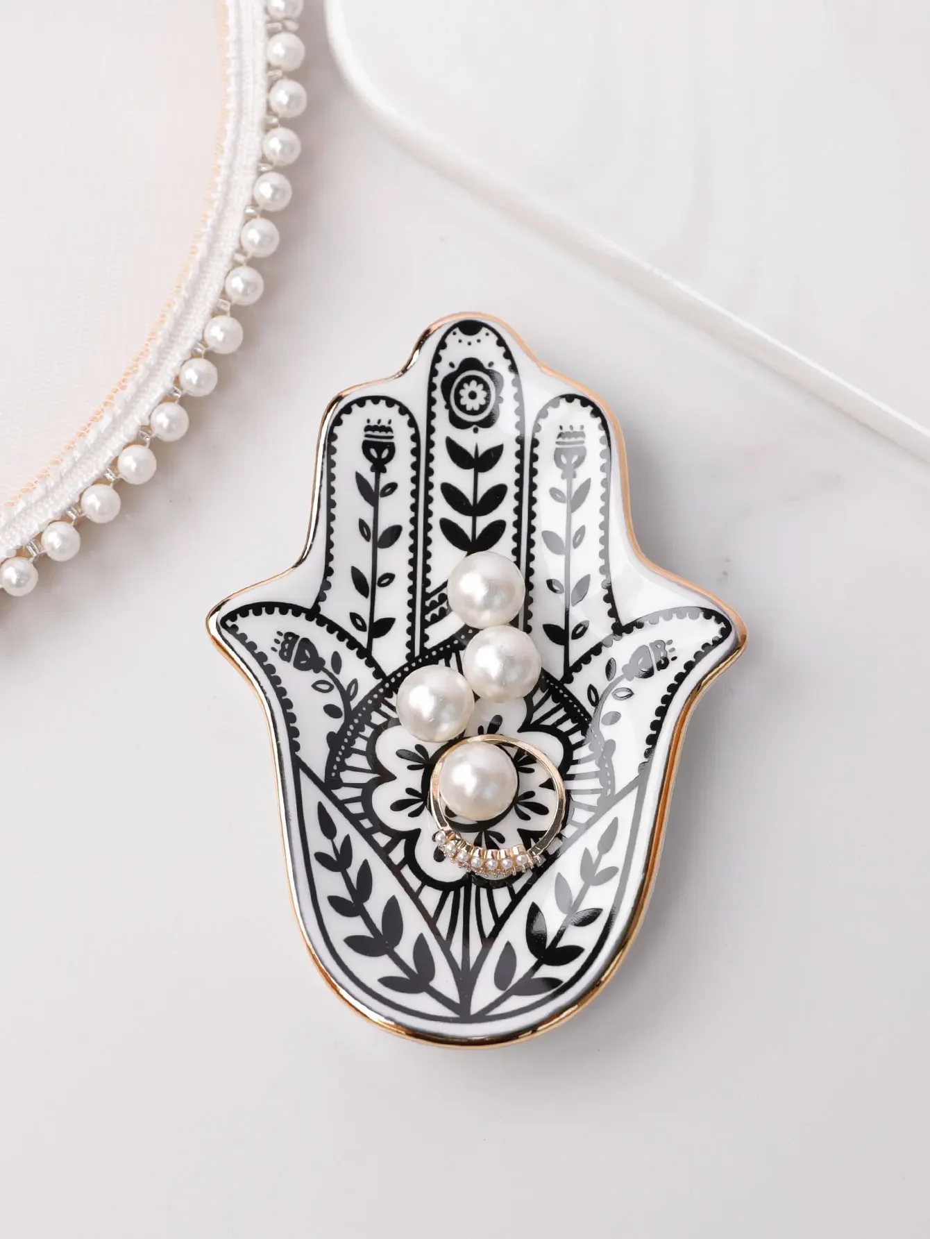 1. **Ceramic Hand Jewelry Tray**: Crafted with elegance, this round, European-style ceramic hand tray is perfect for organizing small jewelry. Made from high-quality ceramic and enamel, it features a Hamsa hand design, embodying themes of love and protection. Ideal for adding a touch of European charm to your dressing table. Origin: China.