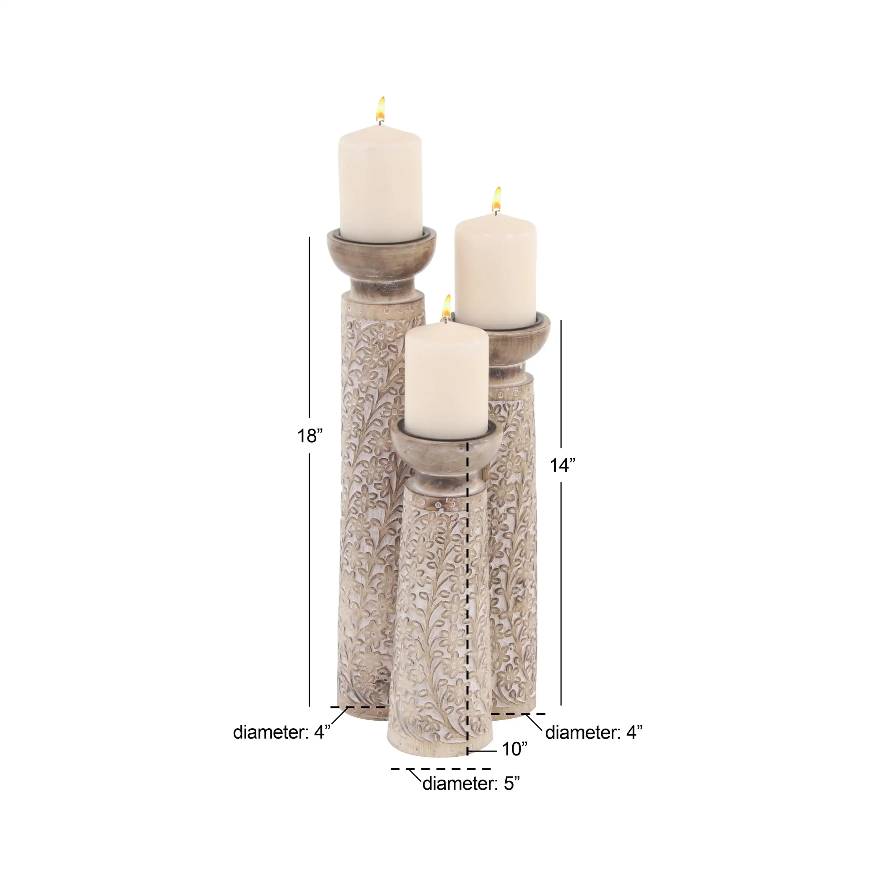 - This mango wood set of 3 candle holders features pillar holders with round plates and tumbler-shaped bodies adorned with intricate floral details